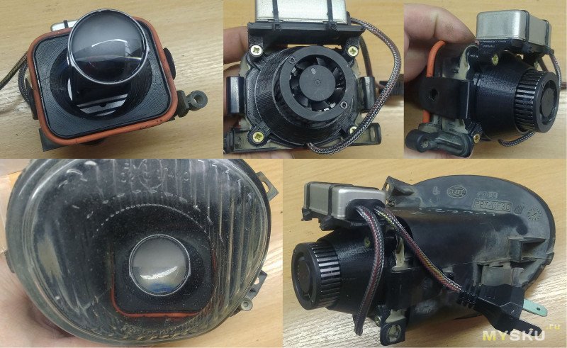 Ну и сборка. прикладываем деталь к которой крепится лампочка, отмечаем и сверлим отверстия в родной детали противотуманки. Вставляем маску — пропихиваем до конца, не стесняемся. Крепим лампочку к переходнику, ставим на место, закрываем кожухом, прикручиваем двумя нижними саморезами 3х25 (провод выводим вниз, понятное дело). Ставим держатель драйвера, скручиваем всё в кучу через него шурупами 2х30. притягиваем драйвер хомутами, вщелкиваем всю конструйню в наружную часть противотуманки