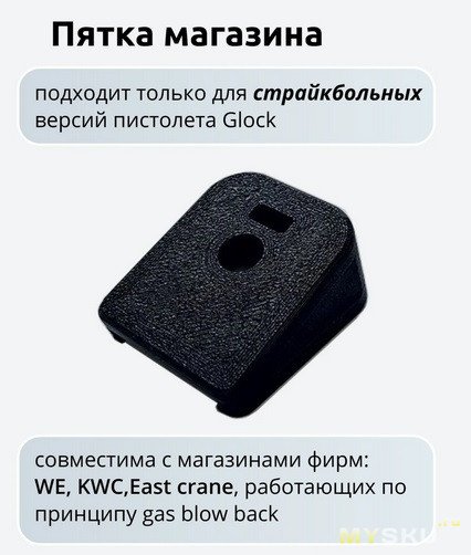 Пятка подходит на магазины любых страйкбольных Глоков. Совместима с магазинами фирм WE, East crane, работающих по принципу gas blow back. На днище пятки имеется одно отверстие для заправки магазина газом и второе отверстие для фиксирующего пина. Облегчает смену магазина при перезарядке.