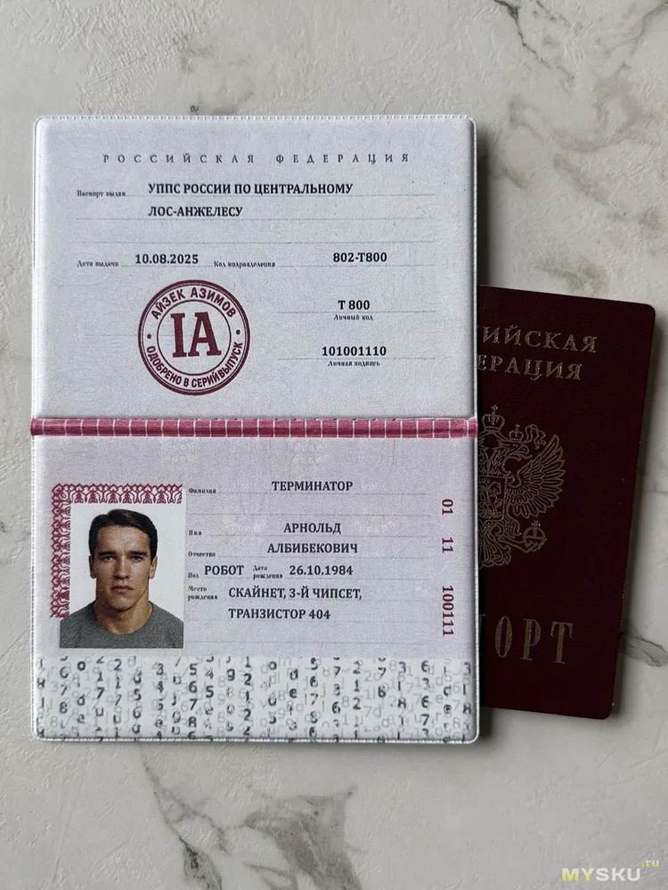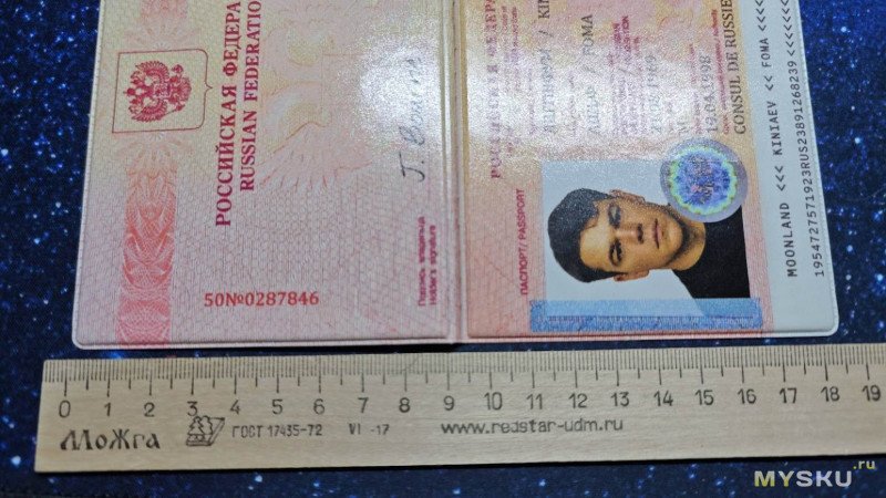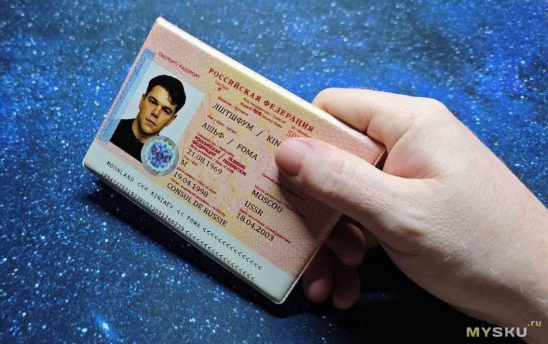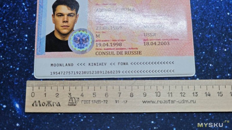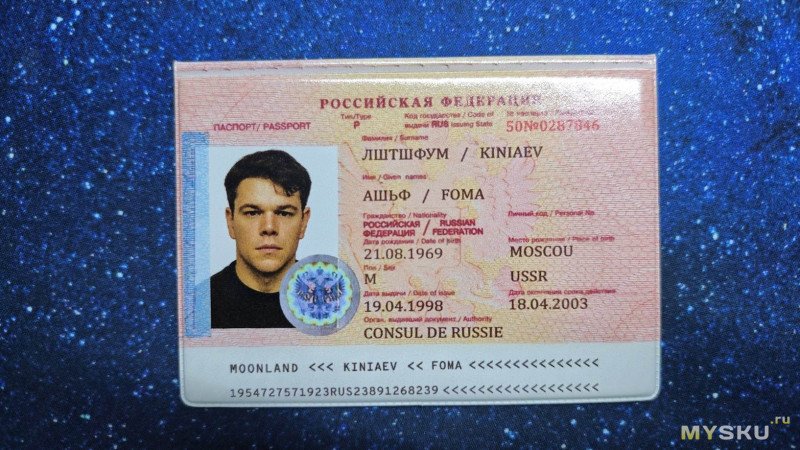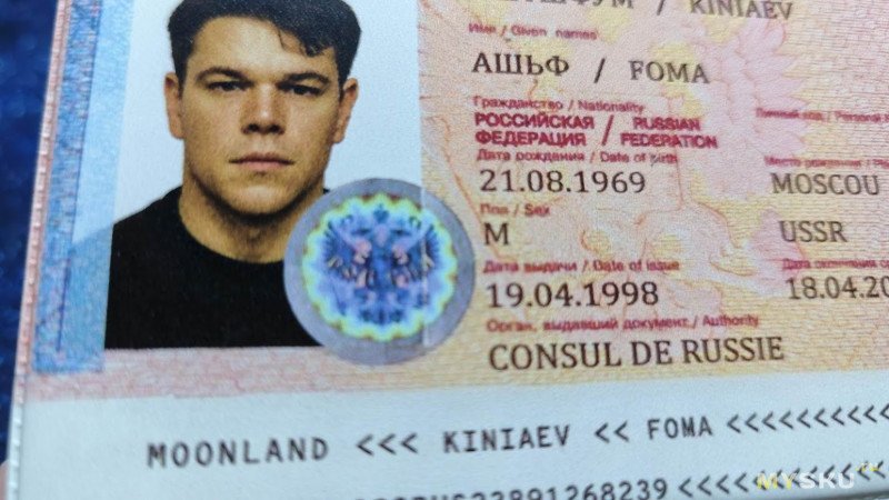 На сей раз он малозначительный, но всё же есть. Если кто, так же, как и я не смотрел фильм 20 лет, то он их и не заметит вовсе. А они есть. Во-первых, зачем-то взяли не оригинальное фото молодого Мэтта Деймона из фильма, а уже то, на котором ему на десяток лет больше. Во-вторых, вместо гербовой печати прилепили «кагбе» голографическую наклейку, а также добавили гильоширную сетку на фото и текст внизу, как на современных паспортах РФ.