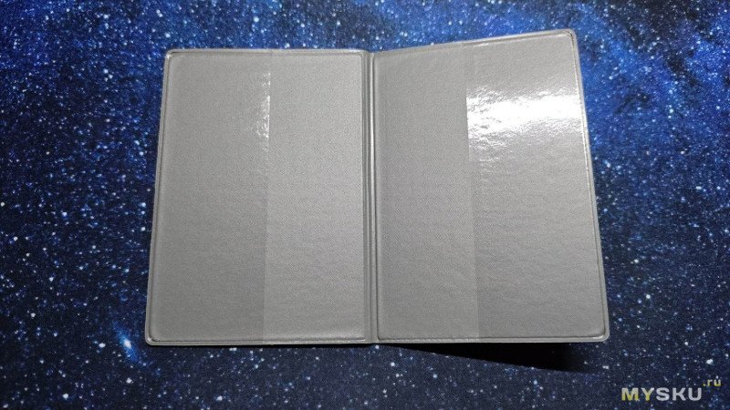 Внутри обложки серый матовый кожзам и два прозрачных полиэтиленовых кармана примерно на половину ширины обложки с каждой из сторон.