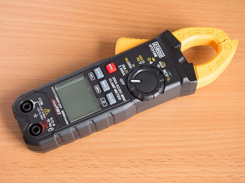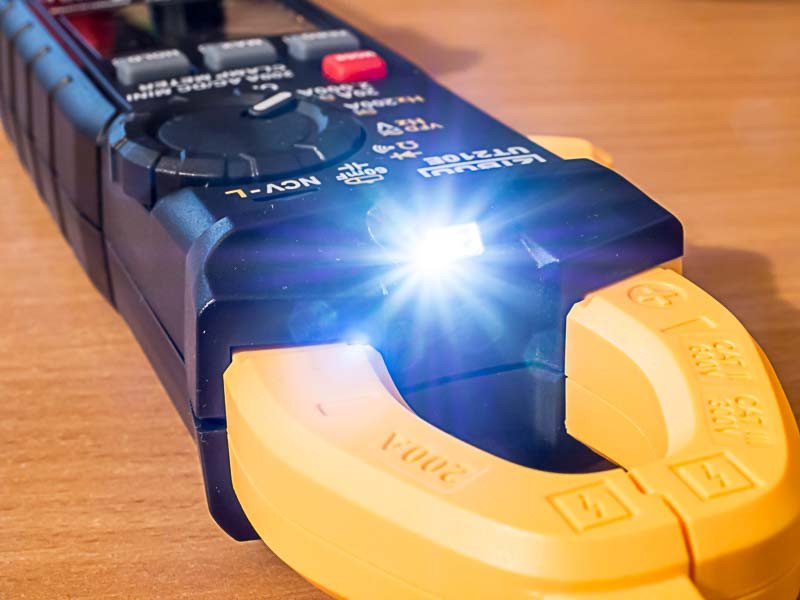 Прибор компактный, позволяет бесконтактно измерять постоянный и переменный ток до 200 ампер, с разрешением до 1 мА (на младшем пределе). Помимо этого, может измерять напряжение, сопротивление, ёмкость, частоту, есть прозвонка, NCV и TrueRMS — в общем, обычный набор функций для недорогого мультиметра.