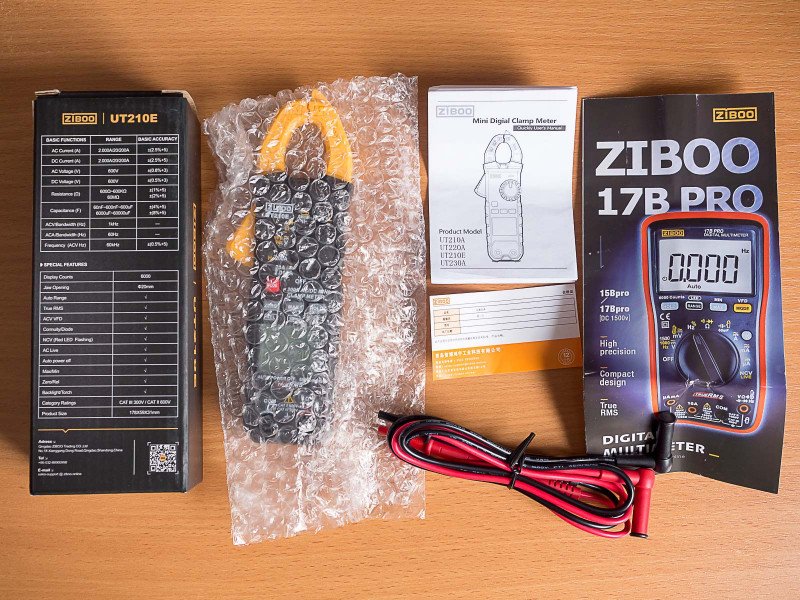 Комплектация минималистичная, сами клещи в пупырке, щупы, инструкция, гарантийный талон на китайском и вкладыш с рекламой еще одной модели Ziboo — 17B Pro (кстати, про неё Дейв EEVBlog недавно выпустил видео).