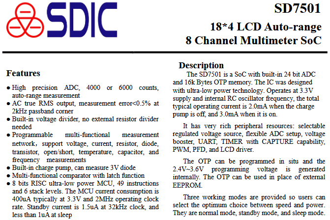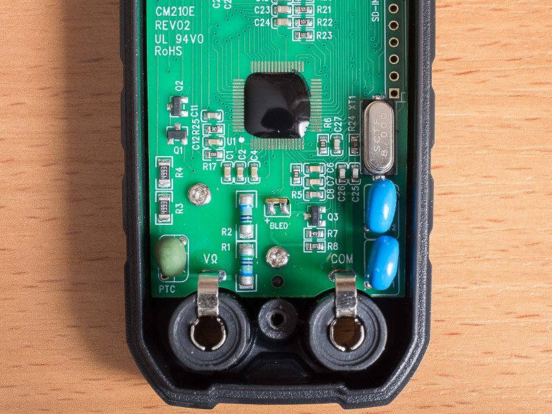 Нижняя часть платы детальнее. От входного гнезда идут три цепи: 1) PTC последовательно + варисторы 2х560 В на землю, обычно так защищают цепь прозвонки и измерения сопротивления; 2) два резистора на 499 кОм (R3+R4), далее дорожка идет к переключателю; 3) два точных резистора на 5 МОм (R1+R2), дорожка идет напрямую в чип. Судя по этому, а также по отсутствию привычной матрицы резисторов, можно предположить что здесь используется какой-то чип из семейства SD750х от SDICmicro.