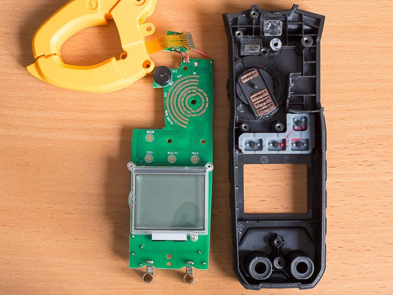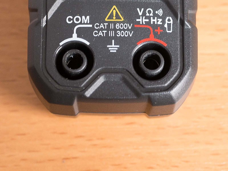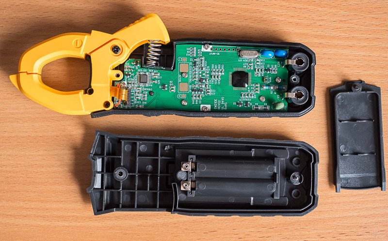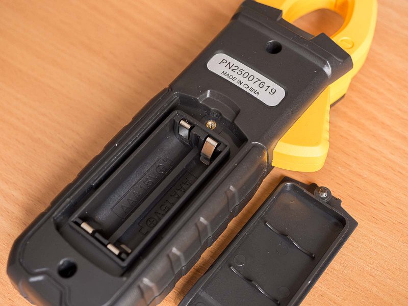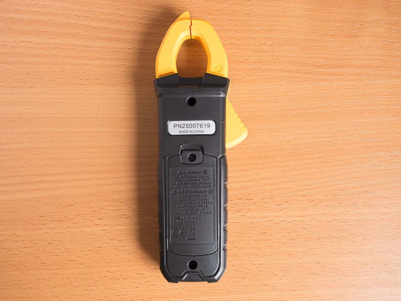 На задней стороне ничего интересного нет, только крышка батарейного отсека, серийник и стандартные предупреждения о том, что неплохо бы отключить щупы от высокого напряжения при замене батареек. К сожалению, никакой клипсы или магнитного держателя тут не предусмотрели.