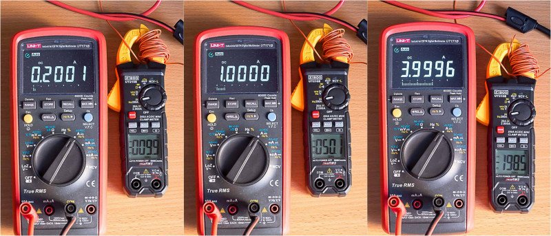 Для проверки на больших токах намотал катушку из 50 витков провода, соответственно, получаем ток 10, 50 и 200 ампер: