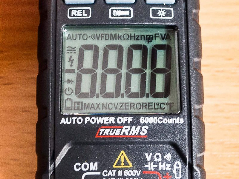 Следующее положение переключателя — переменное напряжение, частотомер, постоянное напряжение. Режим измерения постоянного напряжения идёт последним, довольно неудобно, что для его включения нужно два раза нажимать кнопку, могли бы сделать отдельное положение селектора. На переменке зажатием кнопки MODE можно активировать функцию VFD — фильтр низких частот, который позволяет корректно измерять напряжение с модулированной синусоидой, например, на выходе частотных преобразователей.
