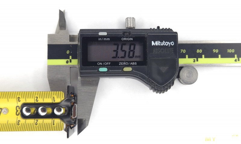 Удивительно, но более редко нужные измерения от упора оказались у этой рулетки точнее, погрешность составляет где-то четверть миллиметра. А вот при привычном измерении в натяг погрешность возрастает до примерно половины миллиметра (на фото кажется, что разница ближе к миллиметру, но это из-за угла съемки, я потом еще перемерял двумя руками, там 0.5 мм). Получается, Zero тут не такой уж и True.
