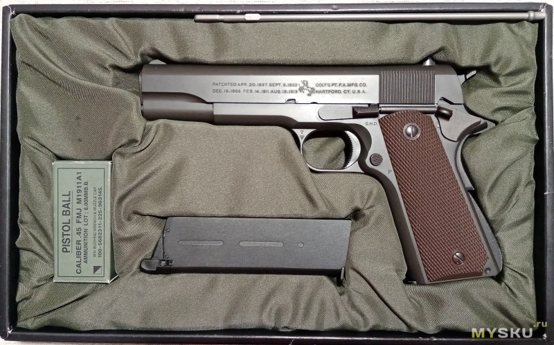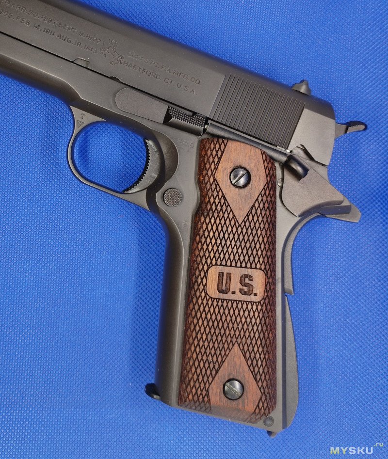 Получается очень точная действующая модель-копия в масштабе 1:1, красивая, но пластиковая. Я заменил на этом Маруевском Кольте М1911А1 рукоятки на оригинальные с огнестрельного образца и он резко похудел в весе