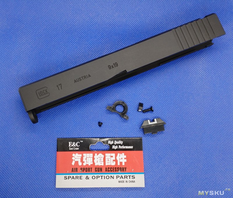 И вот вроде бы просто решение: отлично выполненный затвор с мушкой и целиком. Бери и устанавливай на пистолет.Комплект был заказан на Озоне.