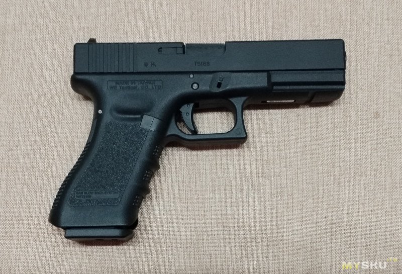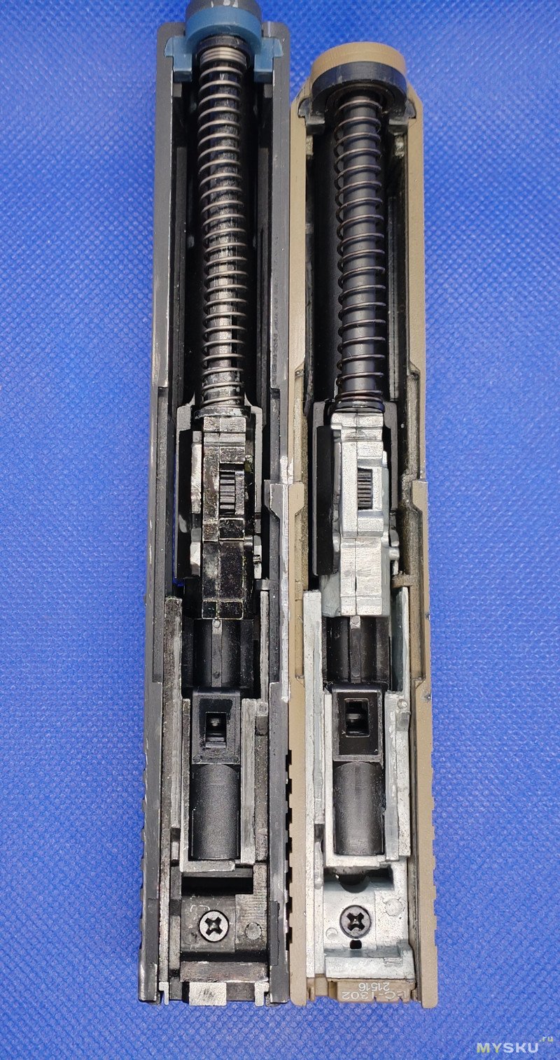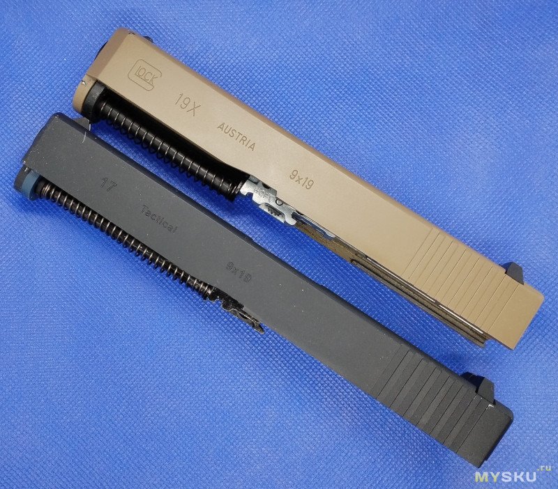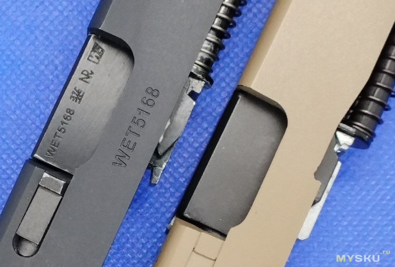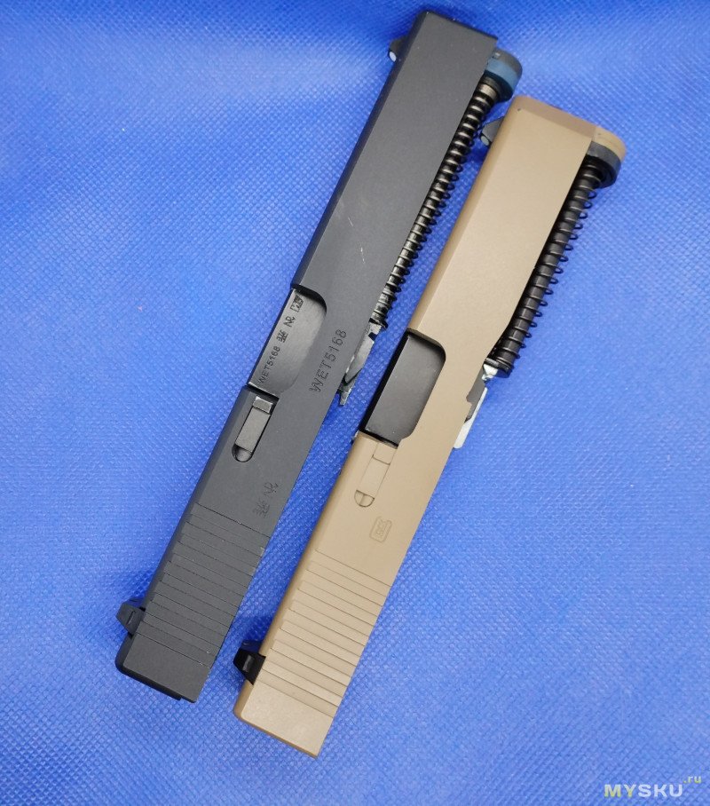 Хотя к примеру сменить затвор от ЕС на пистолет Tokyo Marui М1911А1 – не получилось. Почему я решил, что получится с Глоком? Конструкция Глока от Маруй, которую копировали Тайвань и Китай не очень сложная. И взаимозаменяемость вроде бы прослеживалась. Даже перед покупкой попробовал внешне определить отличия. Слева WE 17-я модель черного цвета, справа ЕС модель 19Х песочного цвета.