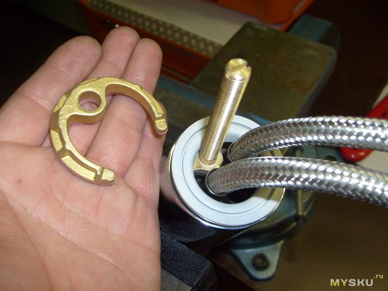 А главное — всё это не имеет смысла. На притягивание смесителя к раковине работает только относительно небольшая часть этой штуковины возле гайки, а «рога» — почти что декорация. И я у себя однажды прекрасно обошёлся большой круглой шайбой — смеситель держало ничуть не хуже.