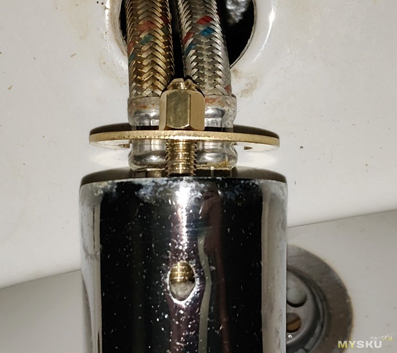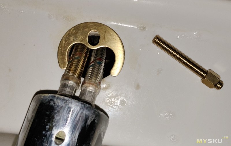 Задача — позвали родственники «посмотреть», почему кран «отваливается», ок — приехал, оказывается другие родственники помогали менять раковину и потеряли ответную часть со шпилькой и рамкой, и вкрутили не родной винт с шайбами, который вообще ничего не держал через несколько использований:
