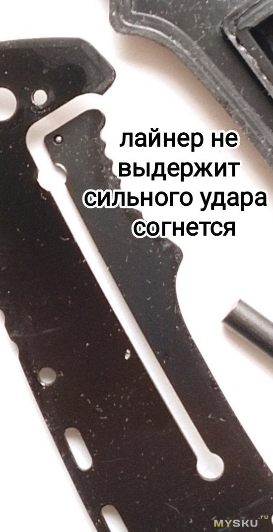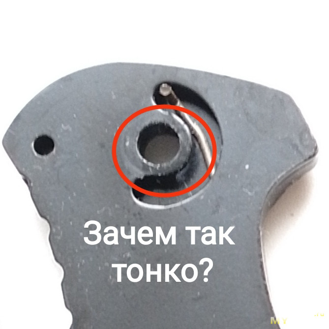 3) вокруг шайбы большой вырез в тонком лайнере, сильно ослабляющий конструкцию, из которого торчит проволока пружины, которая вставляется в дырку в клинке.