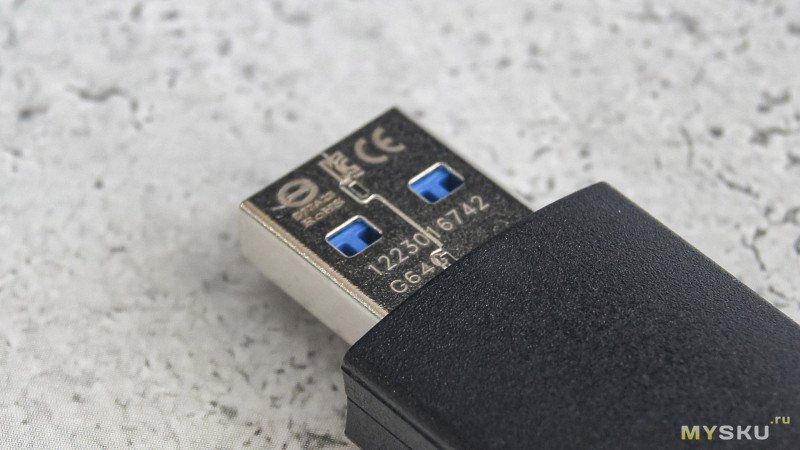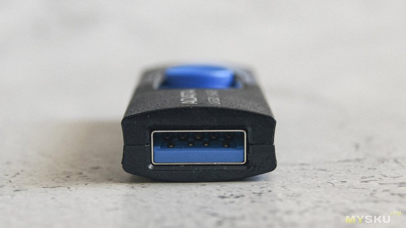 Сам USB-коннектор стандартный металлический. Внутри мы видим вставку синего цвета, что по стандарту цветовой маркировки соответствует интерфейсу USB 3.0 (или, как его сейчас называют, USB 3.2 Gen 1).
