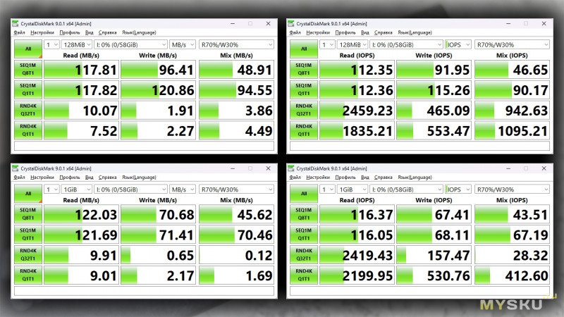 Синтетические бенчмарки все как один рисует очень приятные цифры: преимущественно >100 МБ/с как на чтение, так и на запись. Но мы же тут не просто так собрались и знаем, что «попугаеметрам» верить на слово нельзя.