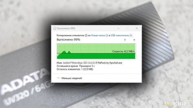 При копировании данных (установочные дистрибутивы) на нашу флешку ADATA UV320 через проводник Windows скорость не скакала и четко держалась на уровень ≈40-42 МБ/с. Это хорошо. Ровно такое же поведение мы видели в тесте на линейную запись.