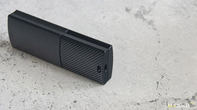 Поверхность имеет матовую, слегка шероховатую поверхность в двух текстурах: матовая шагрень и глянец с частыми диагональными насечками. Это придает устройству более современный и динамичный вид. В руках флешка с такой поверхностью сидит хорошо, нес скользит.