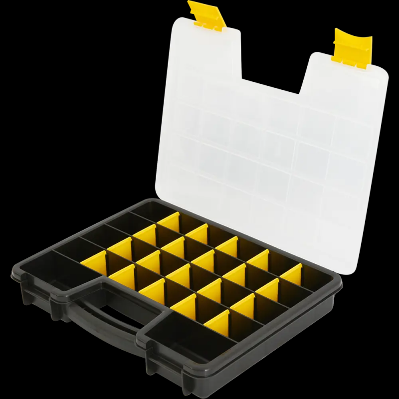 Крышки на петлях, 2 замка(защёлки), 24 ячейки, стенки съёмные.