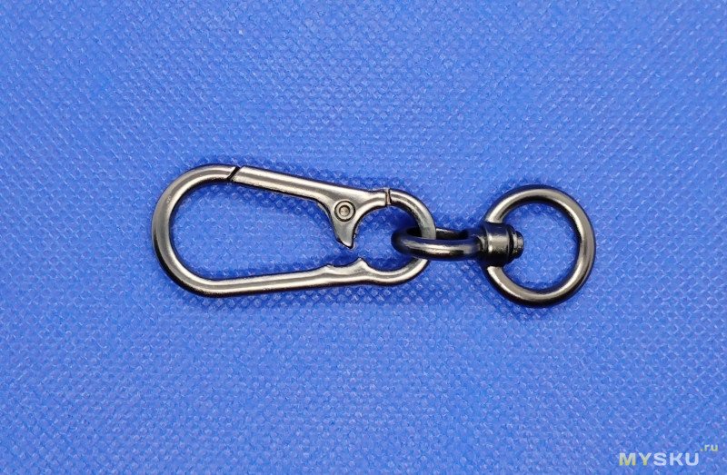 Сам карабин, сделан очень аккуратно и красиво. Имеет двухпозиционный замок: для маленького отверстия, в котором два кольца, и овального карабинного. Каждый элемент данного состава могут работать как самостоятельные.