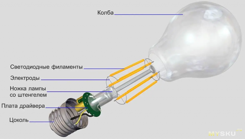 Тут колба из сильно матированного стекла, но около цоколя внутри можно рассмотреть 4 желтые нитки (филамента) с микросветодиодами, которые излучают свет. Разобрать не вариант.