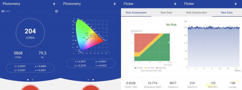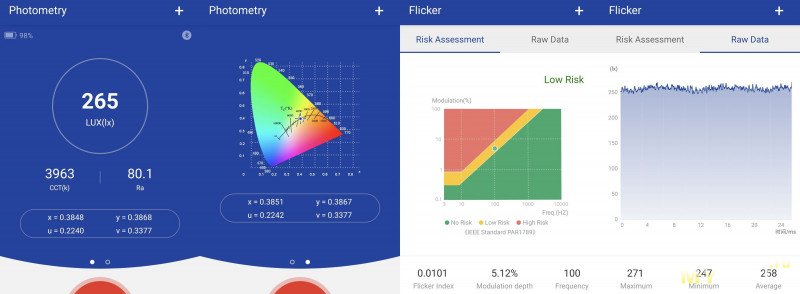 Яркость ожидаемо меньше. Думал Ra будет выше, пульсаций нет, световая температура тоже теплей.