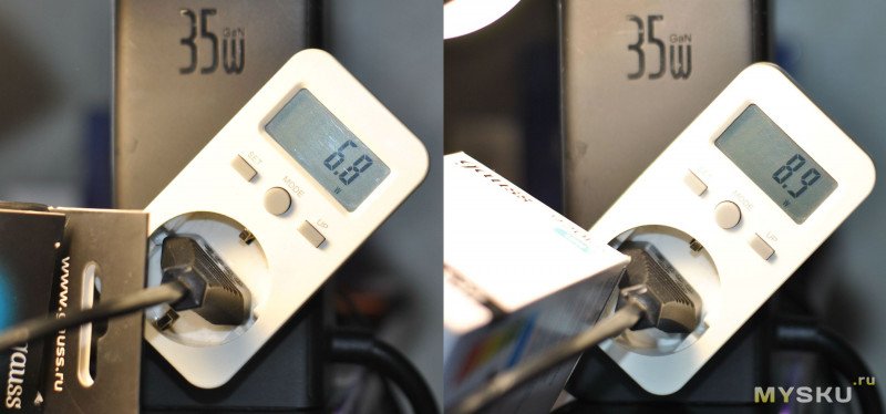 Первый тест измерение потребляемой мощности от сети (обе лампы на коробке 10 Вт). Напряжение в сети 225 В.