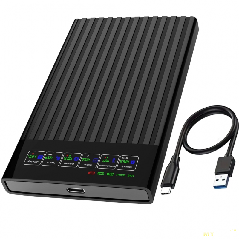 + киллер-фича — встроенный экранчик, отображающий основные параметры S.M.A.R.T. подключенного устройства, даже без подключения к компьютеру