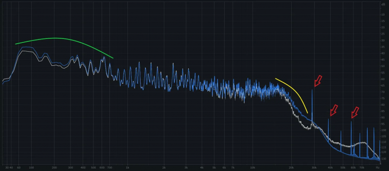 белое винил, на синем спектре (HD) видны высокие линии ультразвуковых помех. Красные стрелки показывают то, что заземление должно гасить, а винил не может передавать.