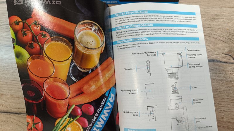 Внешняя картонная коробка с краткой информацией о содержимом. Она более толстая. Внутри еще одна коробка. Она цветная, содержит большое количество информации об устройстве. Тут же можно ознакомиться, какиех фрукты и оводи можно отжимать.