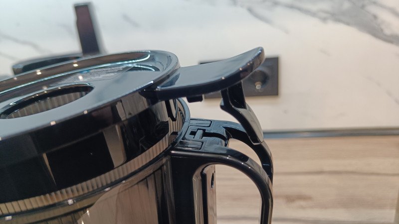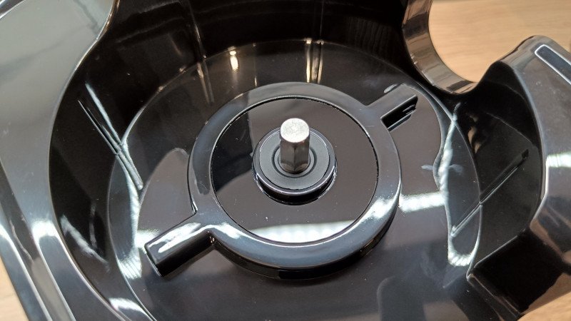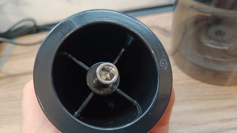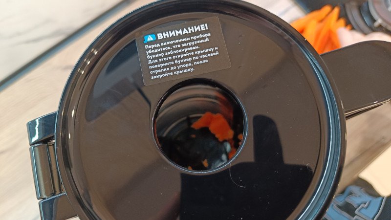 Загрузочный бункер идет отдельным элементом. Сделан из аналогичного крепкого и безопасного пластика. Верхняя часть отделяется, для удобного обслуживания. Внутри бункера можно увидеть большое количество ребер жесткости, которые помогают при размалывании продуктов, так и усиливают выживаемость при переработке грубых овощей. Продукты загружаются через приемное отверстие откидной крышки и если она будет открыта, то устройство не запустится. Таким образом, самостоятельно добраться внутрь до рабочего шнека не получится. Мягкие фрукты или ягоды можно заранее загрузить в бункер на переработку. А более жесткие постепенно подавать через отверстие.