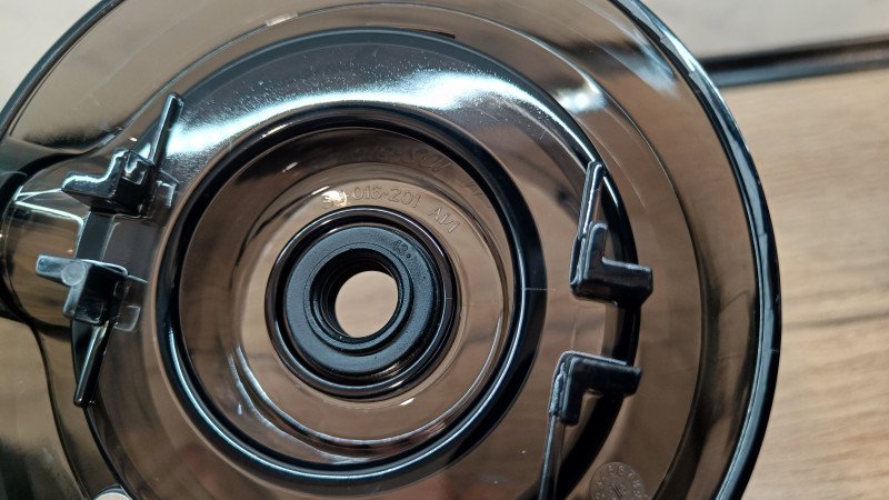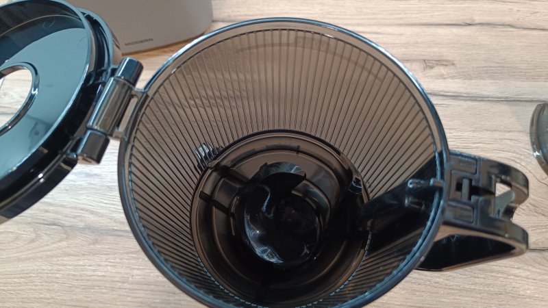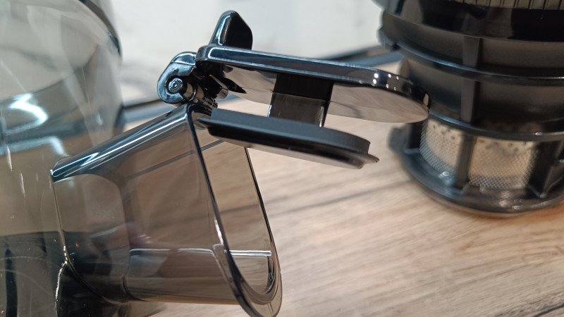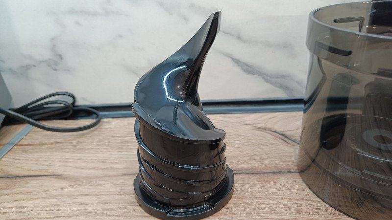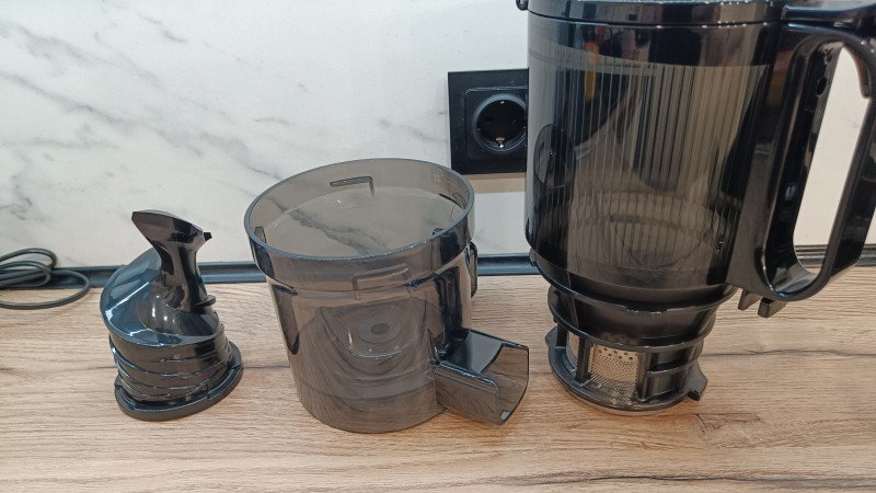 Отжимная корзина из аналогичного пластика. В нижней части присутствует отсек для сбора сока и сброса жмыха. Горловина для сока имеет герметичный клапан с силиконовым уплотнителем. Чтобы сок не протекал сквозь шнек, предусмотрен уплотнительный сальник. Конструкция продумана до мелочей. Даже съемный формирователь жмыха из мягкого силикона, поэтому на выходе получаются плоские «колбаски» отработанной мякоти.