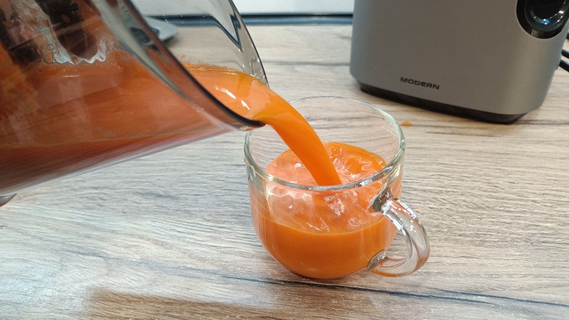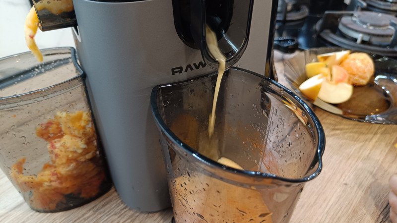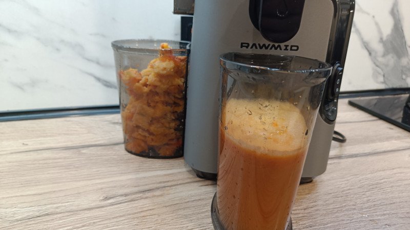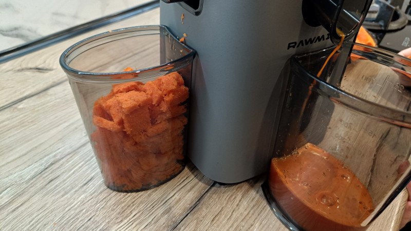В целом, для переработки излишком овощей и фруктов своего дачного участка, более чем достаточно. Соковыжималка Rawmid Modern RMJ-03 с легкостью расправляется и с твердой морковью и с мягкими мандаринами. В конечном результате получаем сухой жмых, который можно дальше пустить в переработку, к примеру, для корма животных. А сок выпить самостоятельно или сделать компоты. Высокая эффективность и скорость отжима. Реверсом даже не потребовалось воспользоваться. Ничего не застряло. Используются безопасные качественные материалы, в том числе и пластик. Отжим на скорости не превышающей 65 оборотов, при сохранении всех витаминов. Есть встроенная защита, когда при открытой крышке бункера, соковыжималка не включится. Очень низкое энергопотребление при достаточной мощности мотора.
