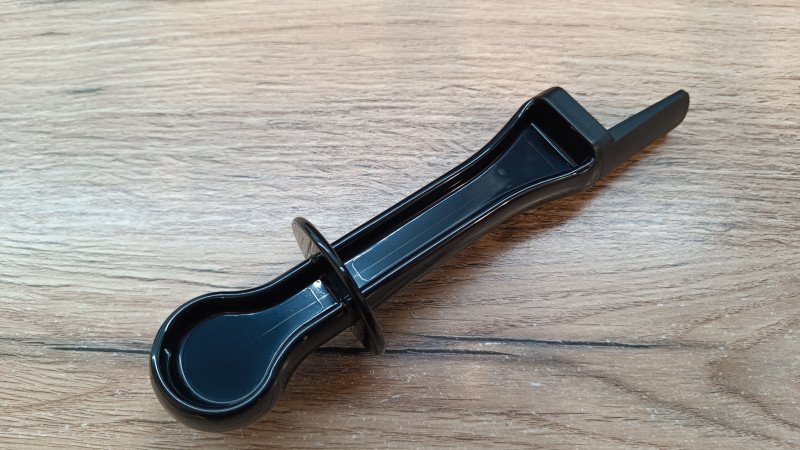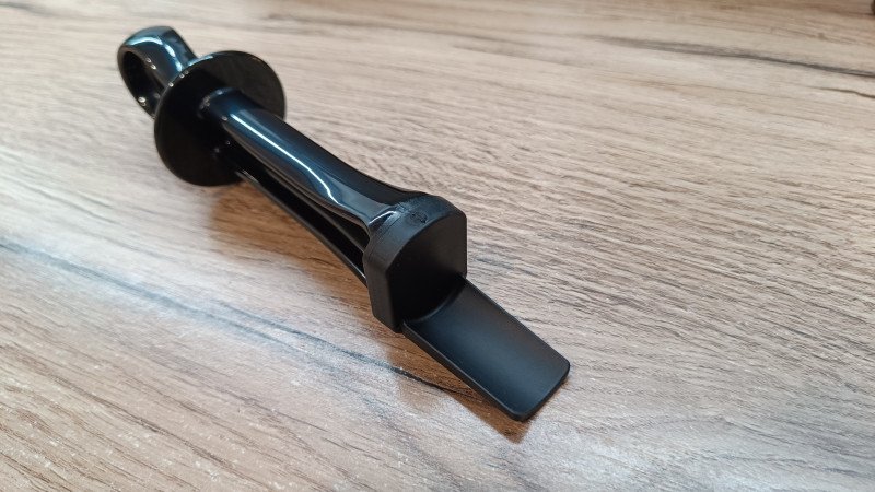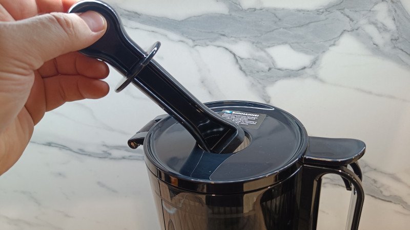 Подавать овощи, фрукты или ягоды в бункер позволяет толкатель. Он сделан довольно необычтно, с виду, обычная пластиковая направляющая с кольцом-ограничителем. Но на конце видим резиновый палец, который не вредит пластику и не застрянет в любом случае.