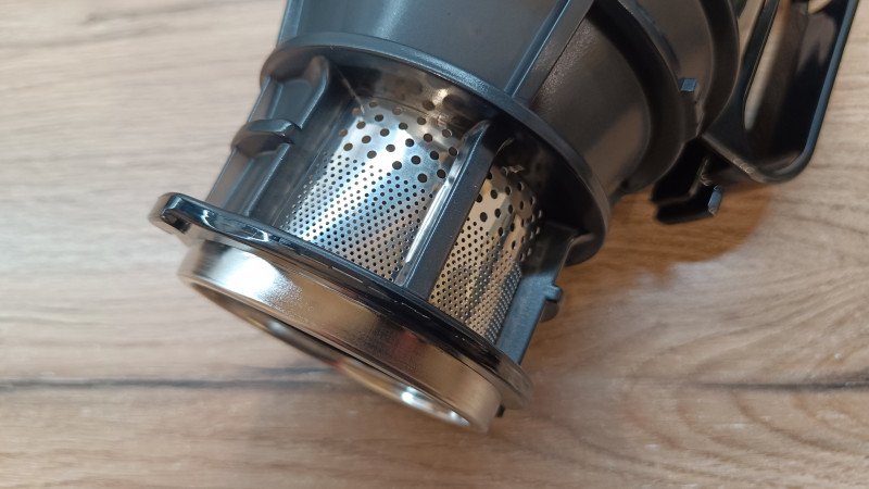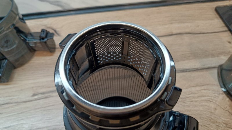 Внутри нижней части бункера есть сетчатый металлический фильтр трехуровневой фильтрации. В верхней части отверстия большие, а в нижней части они меньше по диаметру. Фильтрует жмых и с легкостью пропускает сок. Также можно заметить, что присутствует металлическое кольцо.
