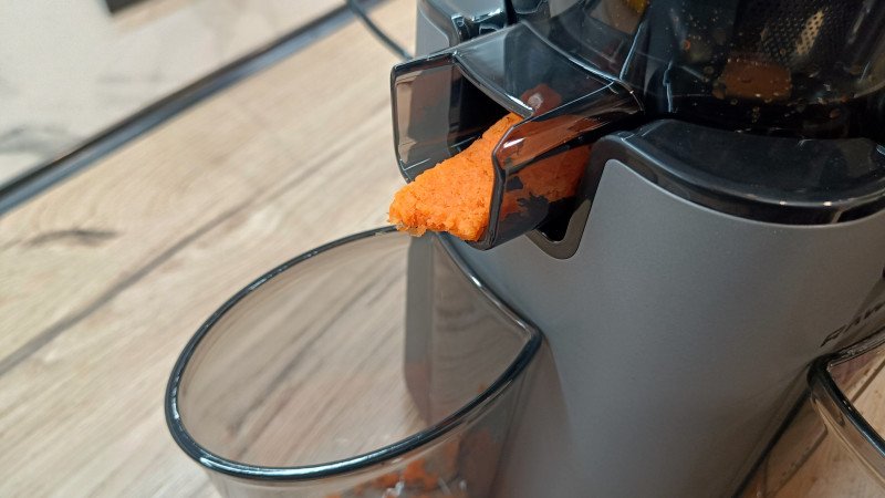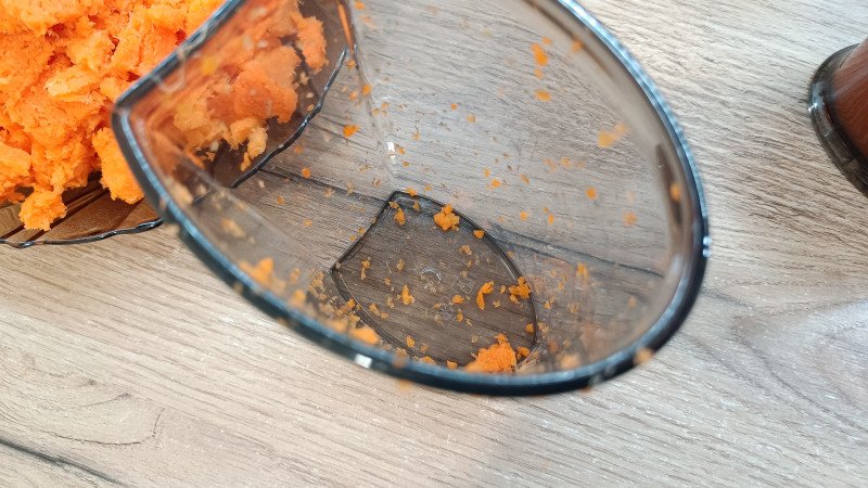 Объем сока будет напрямую зависеть от сочности моркови. Если сразу после сбора урожая, сока будет значительно больше, то уже к концу зимы, сока будет 50/50, как к примеру у меня. Жмых выходит тонкой полоской. Падает постепенно в контейнер и если его сдавить руками, то он совершенно сухой.