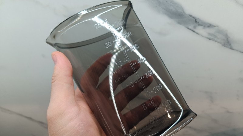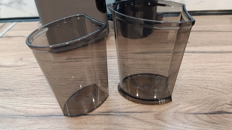 Сразу пробежимся по всей комплектации. Есть 2 стакана/емкости для сбора отжатого сока и жмыха. Внешне они похожи, но для сока имеет маркировку объема, а для жмыха он чуть меньше по объему. Используется крепкий безопасный пластики BPA FREE. Контейнер для сока объемом в 700 мл.