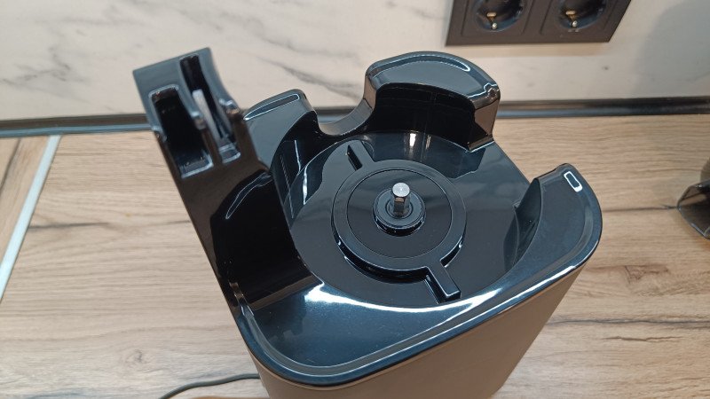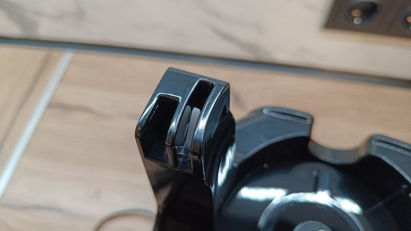 И ещё, тут не видно, но у моей, носик для стока сока был не наклонён, а торчал горизонтально. В результате когда сок тёк слабо, то он стекал по нижней стороне носика прям внутрь подставки с двигателем.