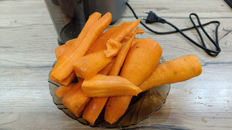 При работе соковыжималки нет посторонних звуков, вращение двигателя равномерное и без видимых усилий или нагрузок. Морковь дробится довольно шустро. Небольшое видео, где ребенок самостоятельно закидывает продукты.