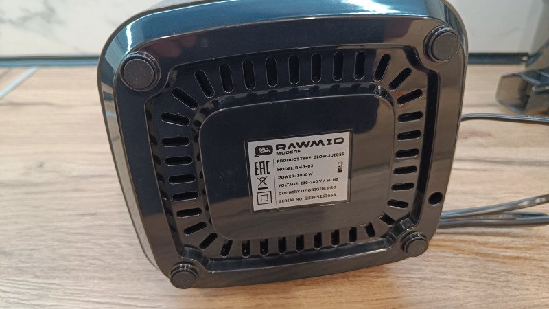 Нижняя часть корпуса с множеством вентиляционных отверстий для отвода тепла. Хотя при перемалывании грубой моркови, соковыжималка не нагрелась. Для устойчивости придуманы резиновые ножки. Вибрация минимальна, большой скорости вращения нет, чтобы ее мотало по всему столу в случае блокировки шпинделя.