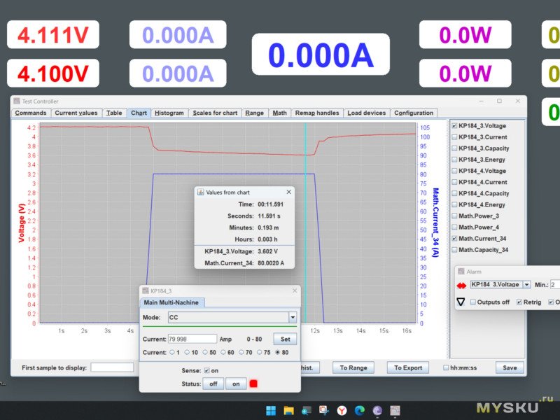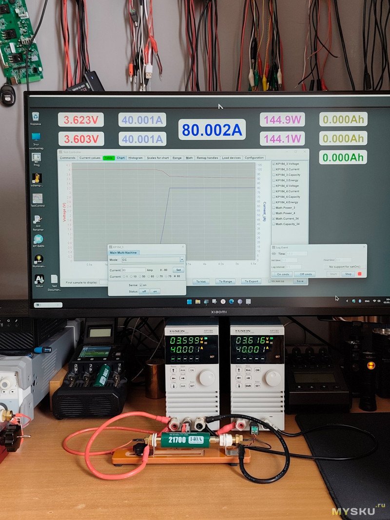 •Токоотдачу в 140А проверить нечем. Нагрузил на 80 Ампер. Для этого использовал две электронных нагрузки подключённых паралельно, конечно.