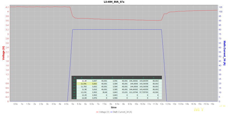 Как видно, аккумулятор держит* 3.6V, при токе 80А. И это уже зачёт.