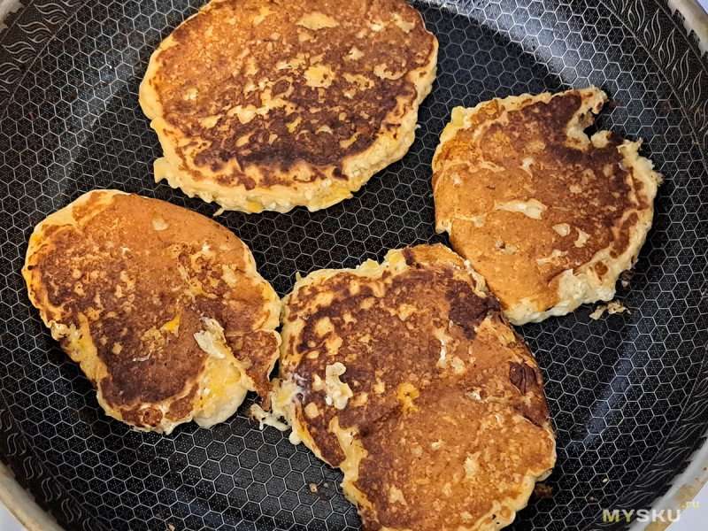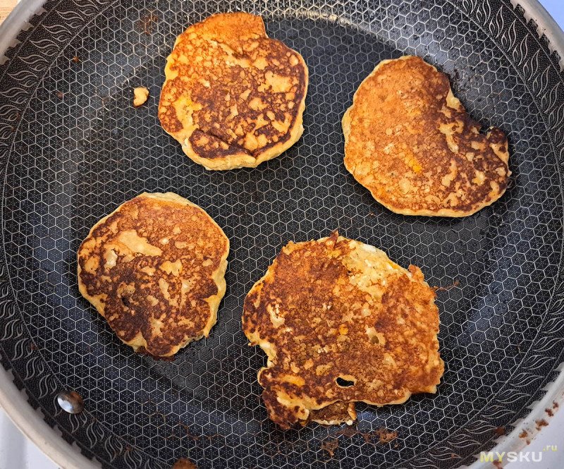 А вот когда я решил пожарить тыквенно-творожные оладьи. Сковородка вела себя так же, как и «уставшая» предшественница с тефлоновым покрытием. То есть сначала оладьи к ней липли, но после хорошего разогрева перестали. Я озадачился.