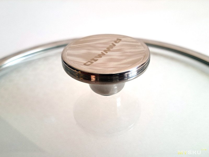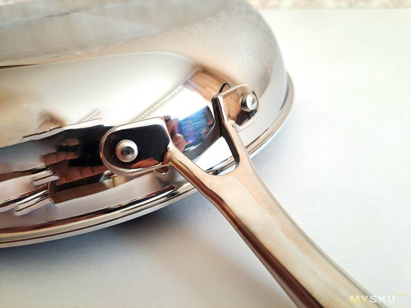 Как видно, ручка совсем не греется. Иногда я готовил на сковороде не менее часа, и ни разу она не нагрелась до некомфортной температуры. А вот ручка на крышке разок стала горячей, когда я долго что-то тушил.