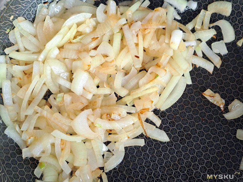 Все блюда я готовил на обычной конфорочной электроплите. Самая большая конфорка диаметром 20 см. А сковорода 28… Но нагрев был равномерным. Например, я поджаривал колбаски и рядом с бортиком, они так же скворчали, как и в середине.