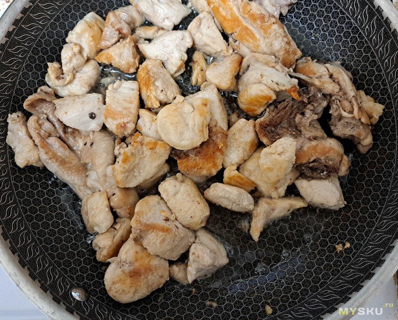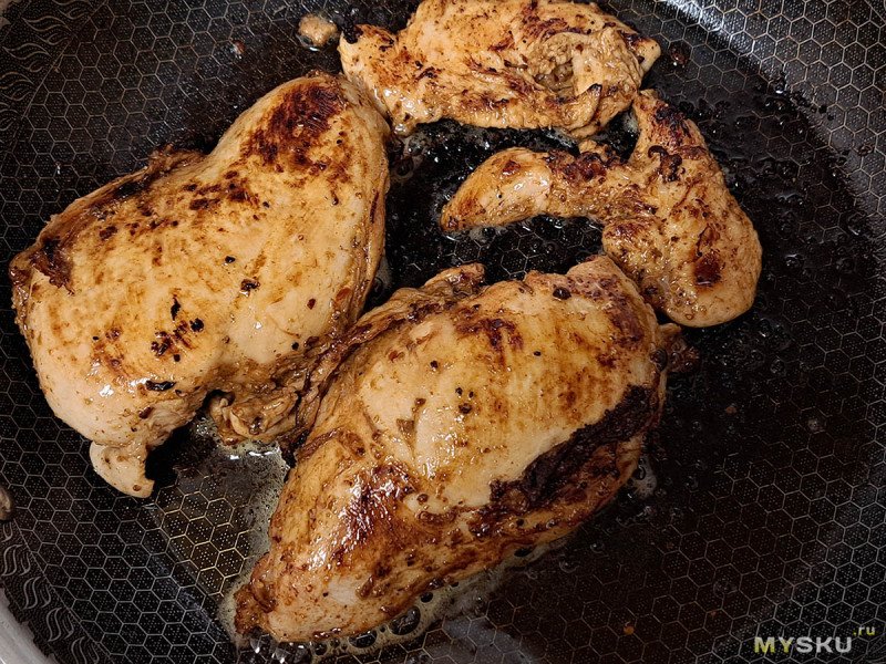Кусочки куриной грудки жарятся без проблем. С золотистой корочкой.