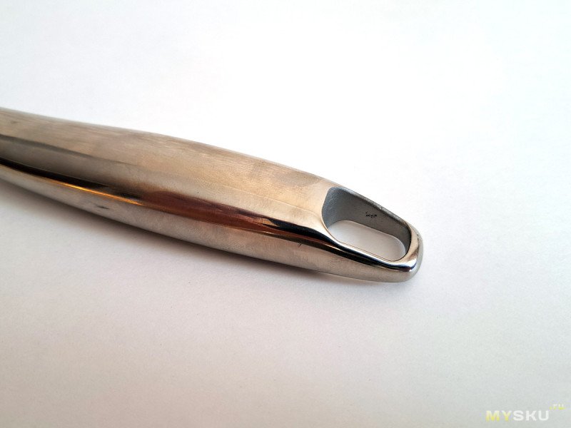 Сама ручка литая с зеркальной полировкой. Есть отверстие для подвешивания сковороды.