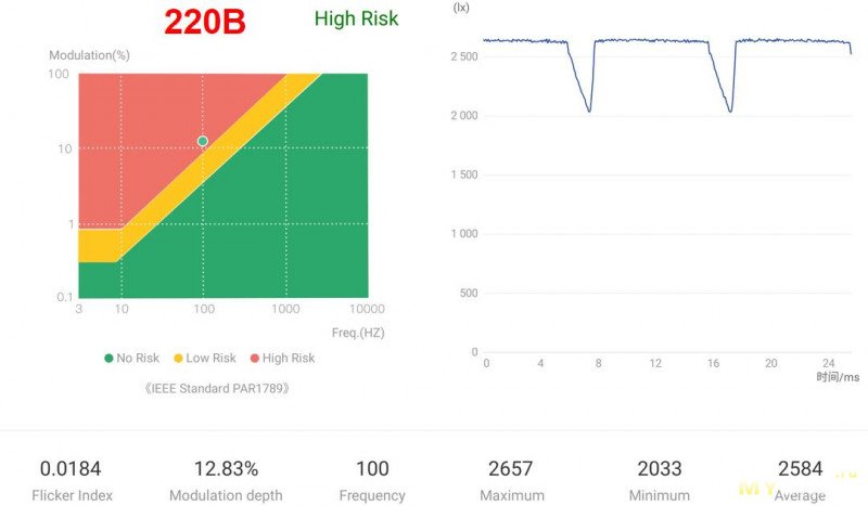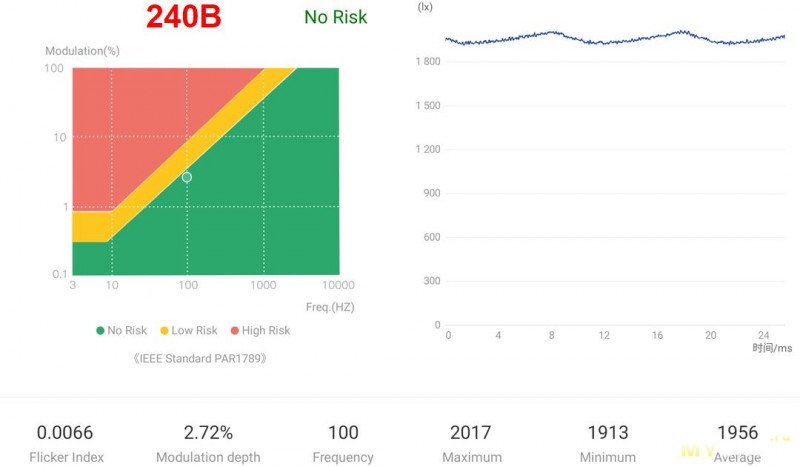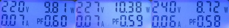 порядка 10.5Вт, и это максимум. При 240В спустя несколько минут работы начинается перегрев и троттлинг со стороны драйвера, потребление снижается и появляются небольшие пульсации на частоте сети, т.е. диапазон напряжений нормальной работоспособности весьма узок.