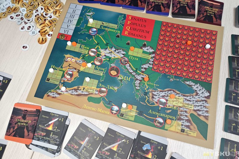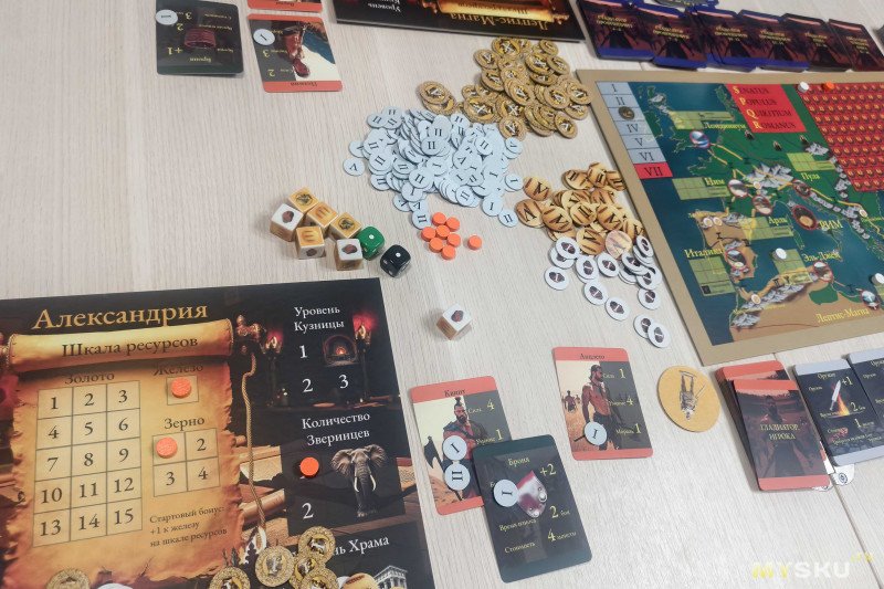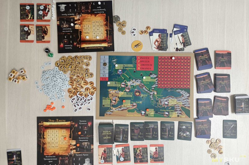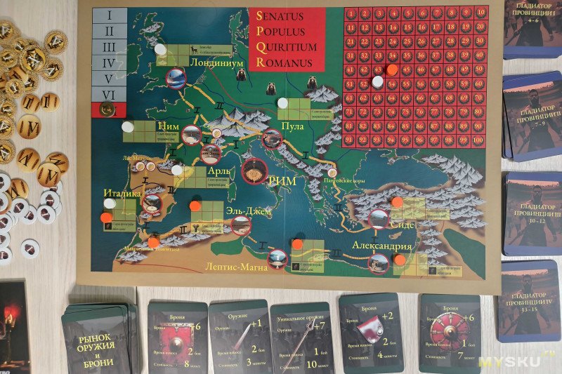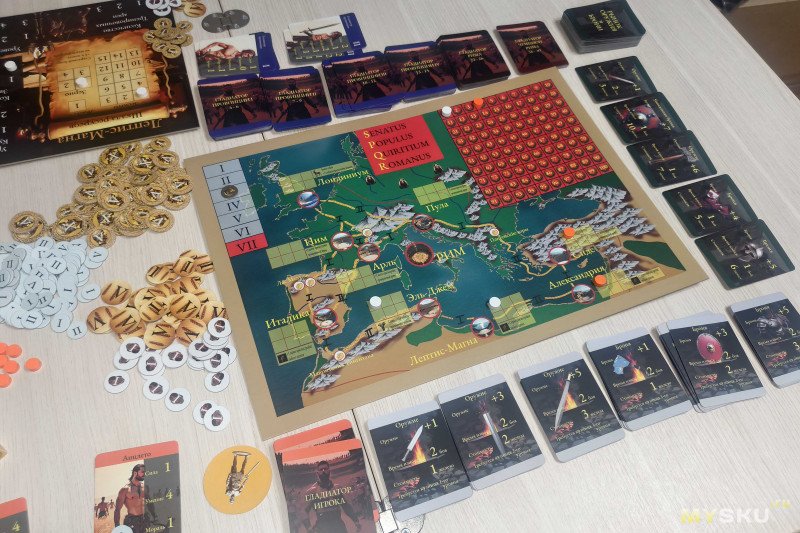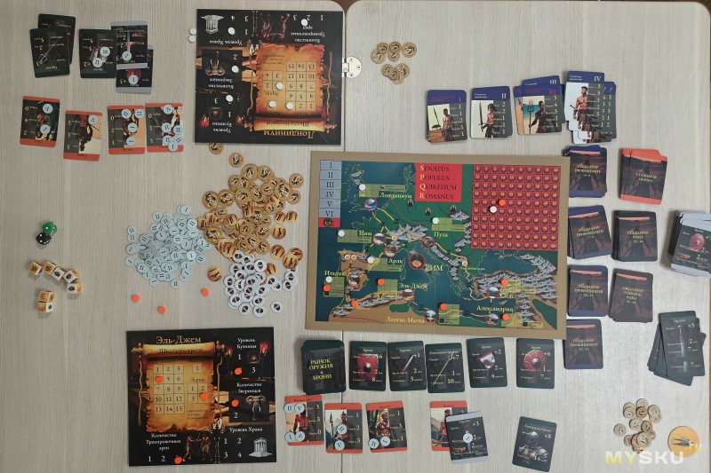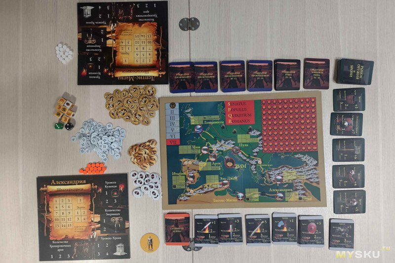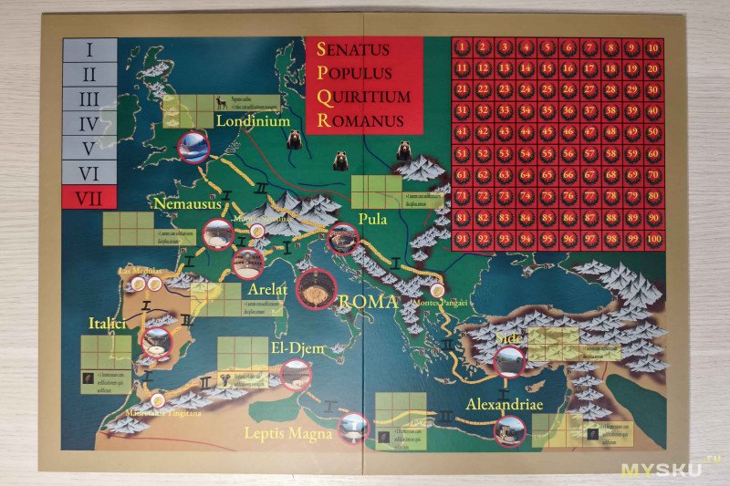 Компоненты раскладываются за 5 минут, для комфортной игры на 4+ игроков потребуется значительное пространство. В центр стола помещают карту Империи, разбитую на провинции – на одной стороне обозначения выполнены на русском, а на другой – на латинском языке.