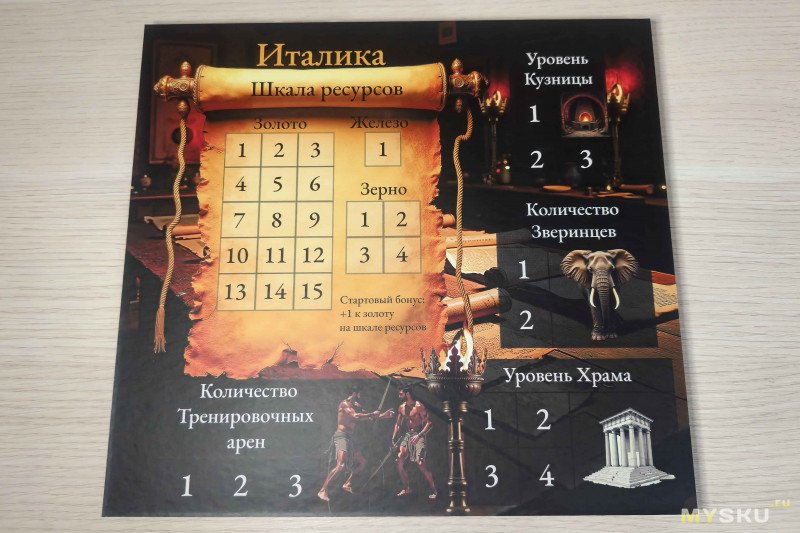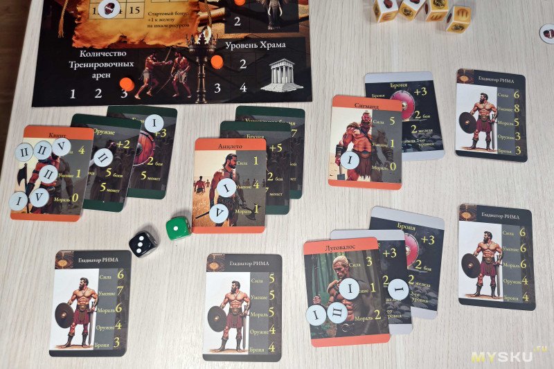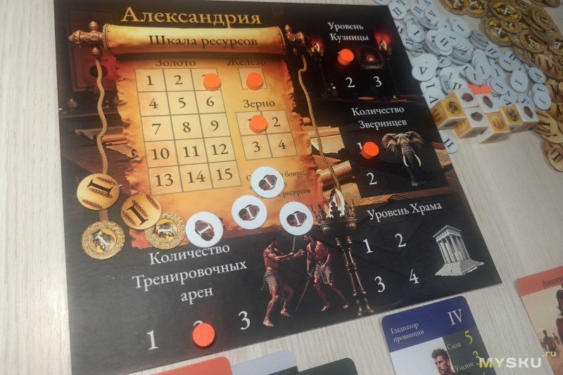 Зданий не слишком много, но выбор имеется. Тренировочные арены позволяют за золото улучшать показатели гладиаторов, а зверинцы увеличивают количество кубиков при получении ресурсов. Храм может быть один, но его можно прокачивать для увеличения бонуса морали на один бой. Кузница позволяет ковать оружие и доспехи (не более двух вещей в ход) в обмен на железо – чем выше ее уровень, тем более могущественные предметы можно создать. При этом после балансировки правил разрешили ее строить сразу второго уровня. Золотая шахта добавляет три золотых монеты к получаемым ресурсам.