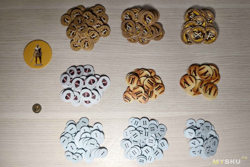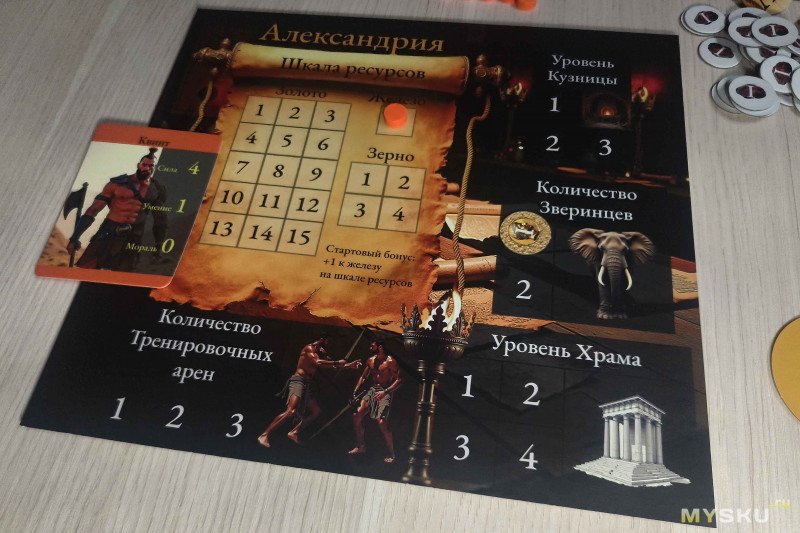 На свободном месте нужно выложить жетоны золота, зерна, железа и повышения характеристик – можно по отдельности, можно и общей кучкой. Жетон хода устанавливается на цифру I на игровом поле. Игрокам также потребуются кубики двух видов: грани дайсов морали содержат от 1 до 3 точек, а на костях ресурсов обозначены зерно, золото и железо.